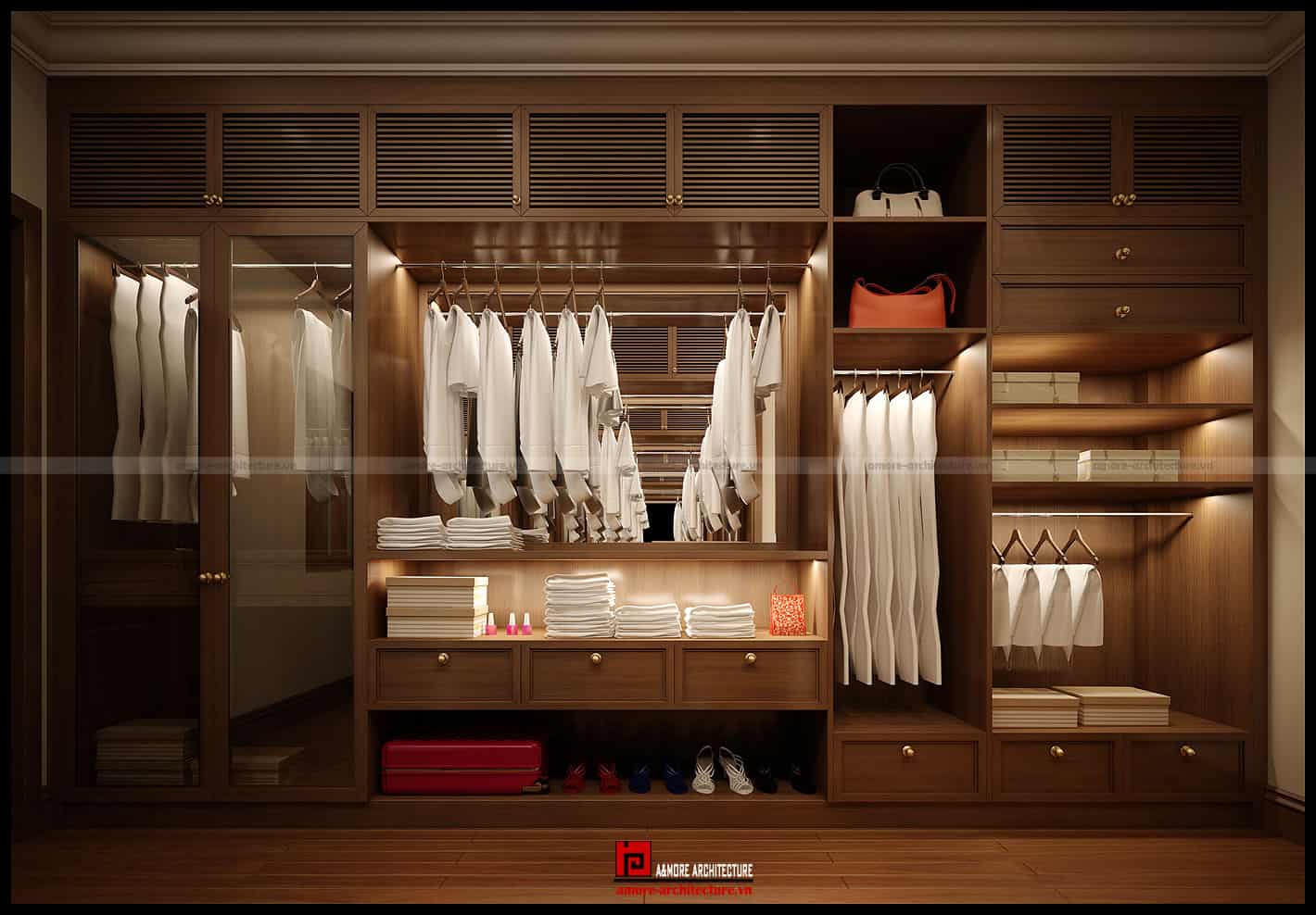 Từ ngăn treo đồ cho đến hộc để giày đều được tính toán kĩ lưỡng. Do tính chất những chiếc giày thường hay có mùi khi sử dụng nên hộc đựng giày không cánh được thiết kế ở vị trí dưới cùng. Với những hộc tủ không cánh được thiết kế dành riêng cho những chiếc túi điệu đà đa màu sắc sẽ là điểm nhấn giúp chiếc tủ thêm phần duyên dáng.