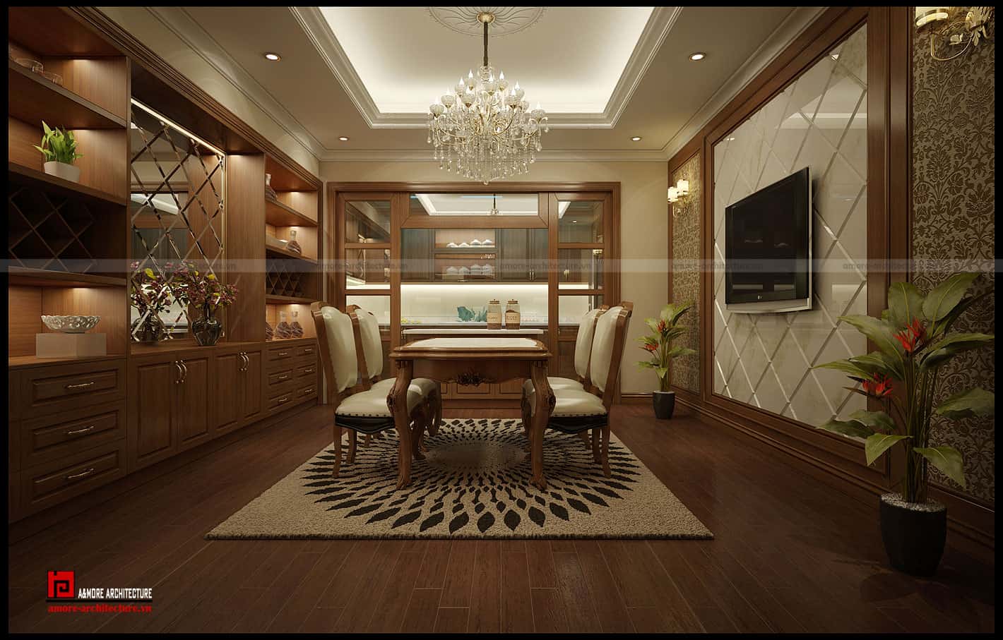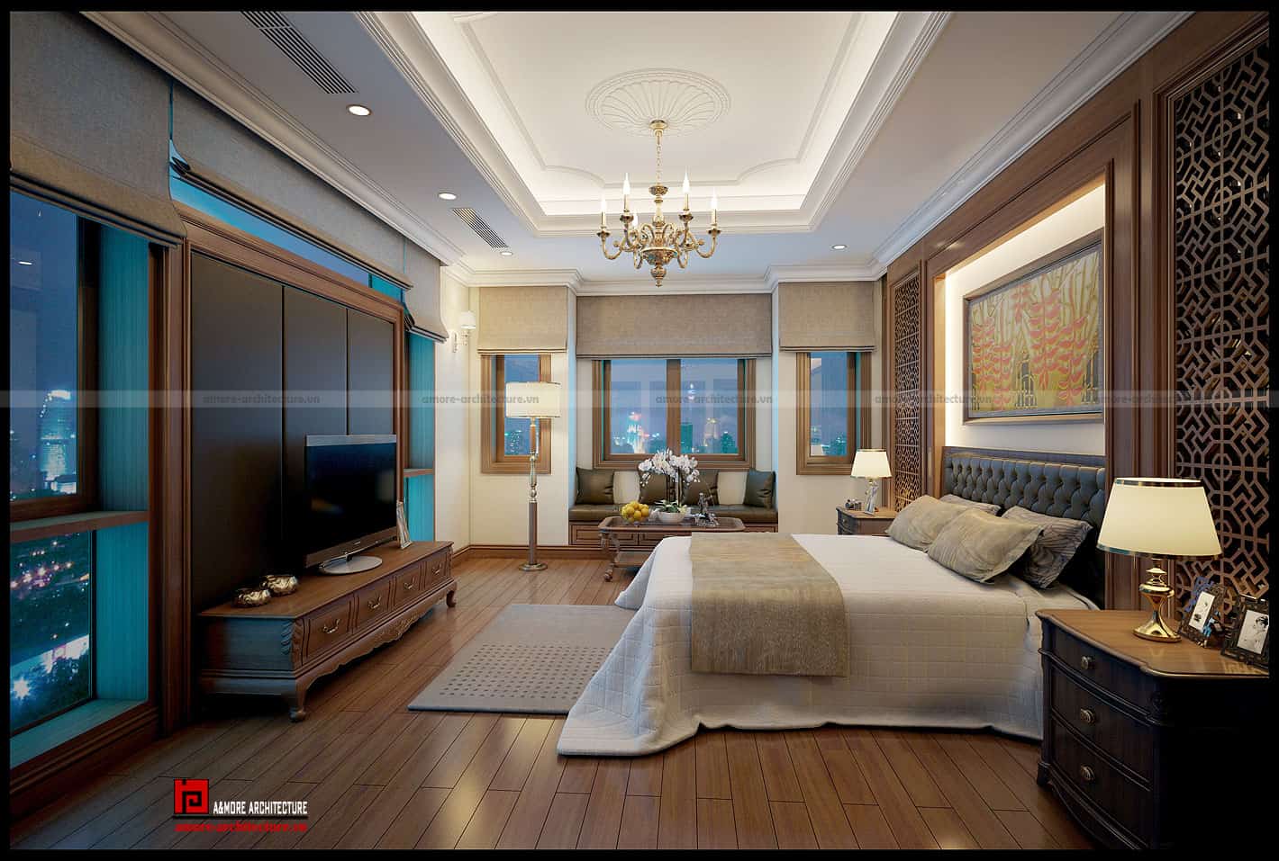 Vẫn là gam màu nâu chủ đạo kết hợp với những điểm nhấn màu kem tạo sự tinh tế trong tổng thế. Phía sau kệ tủ ti vi là thiết kế vách tường thành những mảng hình khối lớn màu nâu trầm với những chi tiết phào chỉ nổi khá mềm mại đem đến vẻ đẹp hài hòa cho phong cách tân cổ điển. Hai bên, những ô cửa kính trong suốt giúp chan hòa ánh sáng tự nhiên cho căn phòng. Vào buổi đêm, những ánh đèn thành phố lấp lánh sẽ đem tới cho ngôi nhà một vẻ đẹp lung linh huyền ảo, cho chủ nhân cảm giác như đang được đắm mình trong một khách sạn 5 sao đẳng cấp.