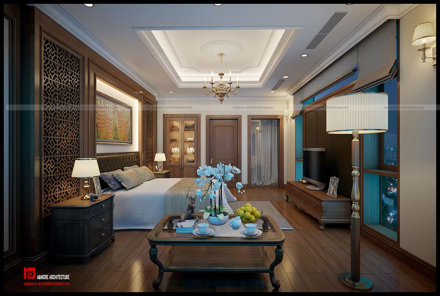 Phía bên cạnh sát góc tường, chúng tôi đặt một bộ sofa màu cafe kết hợp với chiếc bàn kính trong suốt với ý đồ tạo nơi để chủ nhân ngồi nghỉ ngơi, đọc sách hay đơn giản như nhâm nhi một tách trà, thư giãn cơ thể sau một ngày làm việc mệt mỏi trước khi chìm vào giấc ngủ. Những vật dụng nhỏ như đèn trần, đèn bàn hay lọ hoa cũng giúp cho không gian phòng ngủ trở nên ấm cúng và duyên dáng hơn.