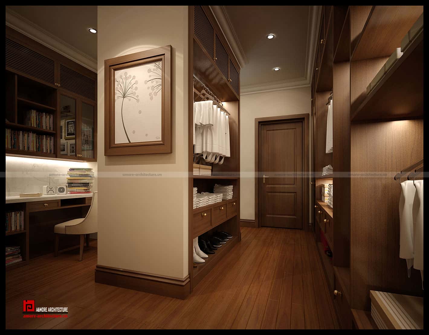 Phòng làm việc kết hợp với phòng thay đồ trong cùng một không gian liên đới với nhau. Do chủ nhà là người sống theo phong cách hiện đại, hay đi nước ngoài và có thú sưu tập vali cùng những đồ vật thời trang nên muốn có nhiều không gian riêng để lưu giữ những món đồ quý giá này.