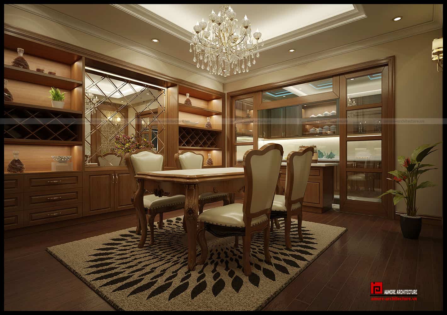 Sự đối chiếu cân bằng trong không gian chính là nét đẹp thu hút trong căn phòng. Sự hòa hợp từ vị trí cho tới hình khối giữa ô cửa thoáng trên tủ bếp được bày trí cân bằng với bức vách ngăn đối diện qua chiếc bàn ăn. Sự phối hợp chất liệu linh hoạt giữa gỗ tự nhiên màu trầm với chất liệu đá màu trắng tạo thành vách tạo nên sự sang trọng mà không phải nhà bếp nào cũng có được. Từ chiếc thảm trải nền cho đến giấy dán tường cũng đều được lựa chọn thật kỹ lưỡng, tạo cho toàn bộ không gian có màu sắc hòa hợp, hấp dẫn.
