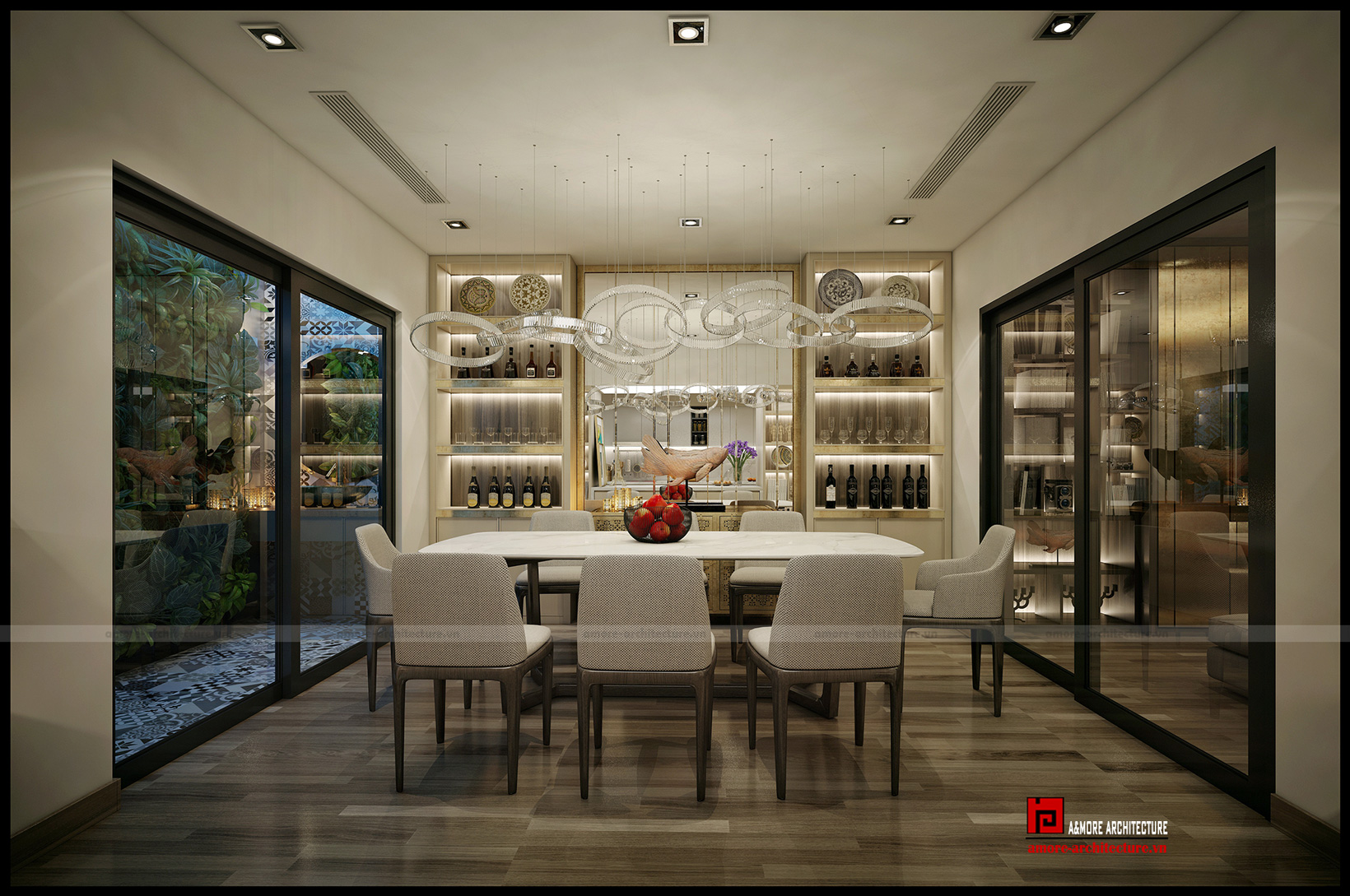 Nếu như thông thường, phòng bếp và phòng ăn sẽ nằm trên cùng một không gian thì tại căn nhà phố Hoàng Cầu, phòng ăn lại được đặt tách biệt hẳn với các không gian khác. Hệ thống đèn trang trí ấn tượng, bộ bàn ăn sang trọng khiến không gian trở nên tiện nghi chẳng khác gì ở nhà hàng.