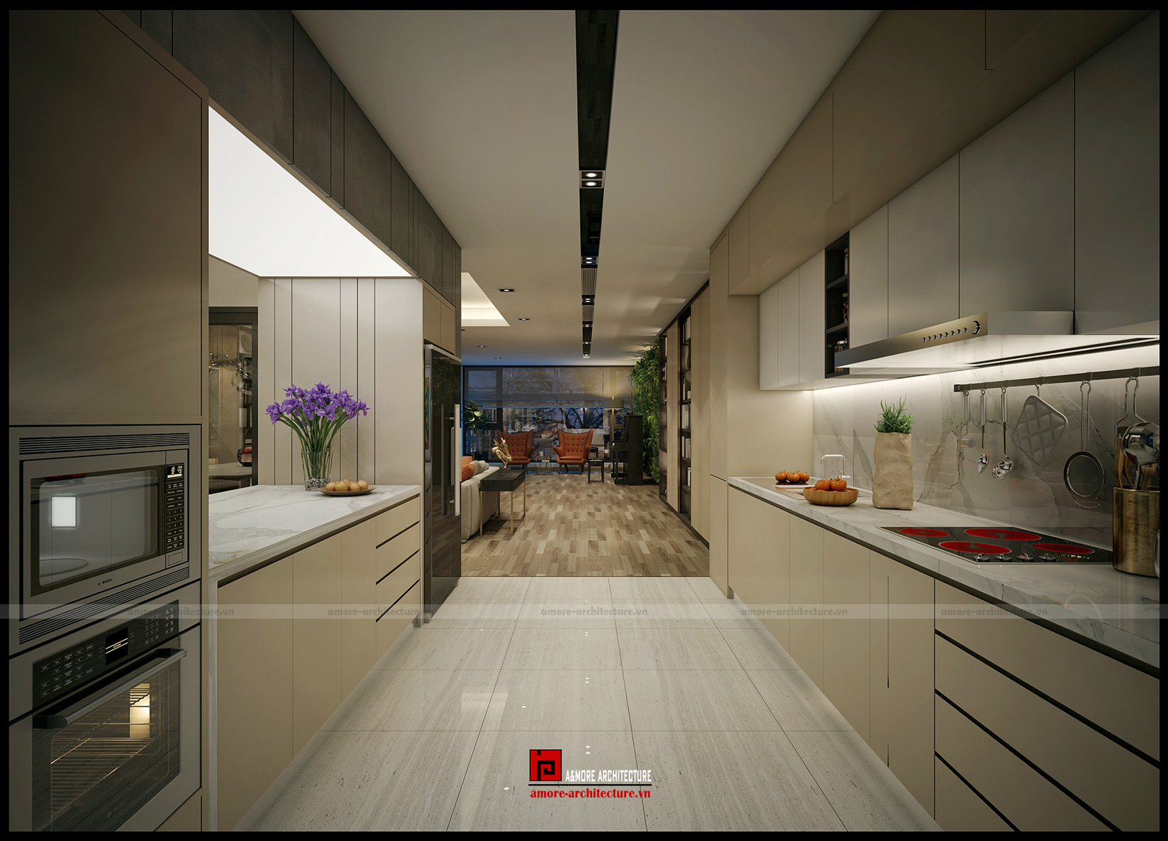 Phòng bếp được thiết kế giản dị nhưng đầy đủ tiện nghi với hệ thống các đồ nội thất bài trí gọn gàng và ngăn nắp. Chúng được phối cùng bộ tủ bếp màu kem mang đến cảm giác nhẹ nhàng và rộng rãi. Bên cạnh đó, xu hướng chọn nội thất bếp hiện đại vài năm gần đây thường hướng đến những tông màu tối. Lý do chính là vì gam màu này sẽ mang đến sự sang trọng cũng như dễ dàng giữ vệ sinh. Tuy nhiên, nhà bếp màu tối có nhược điểm là dễ tạo cảm giác diện tích bị nhỏ lại. Do đó, gia chủ không nên chọn màu này làm màu chủ đạo cho không gian.