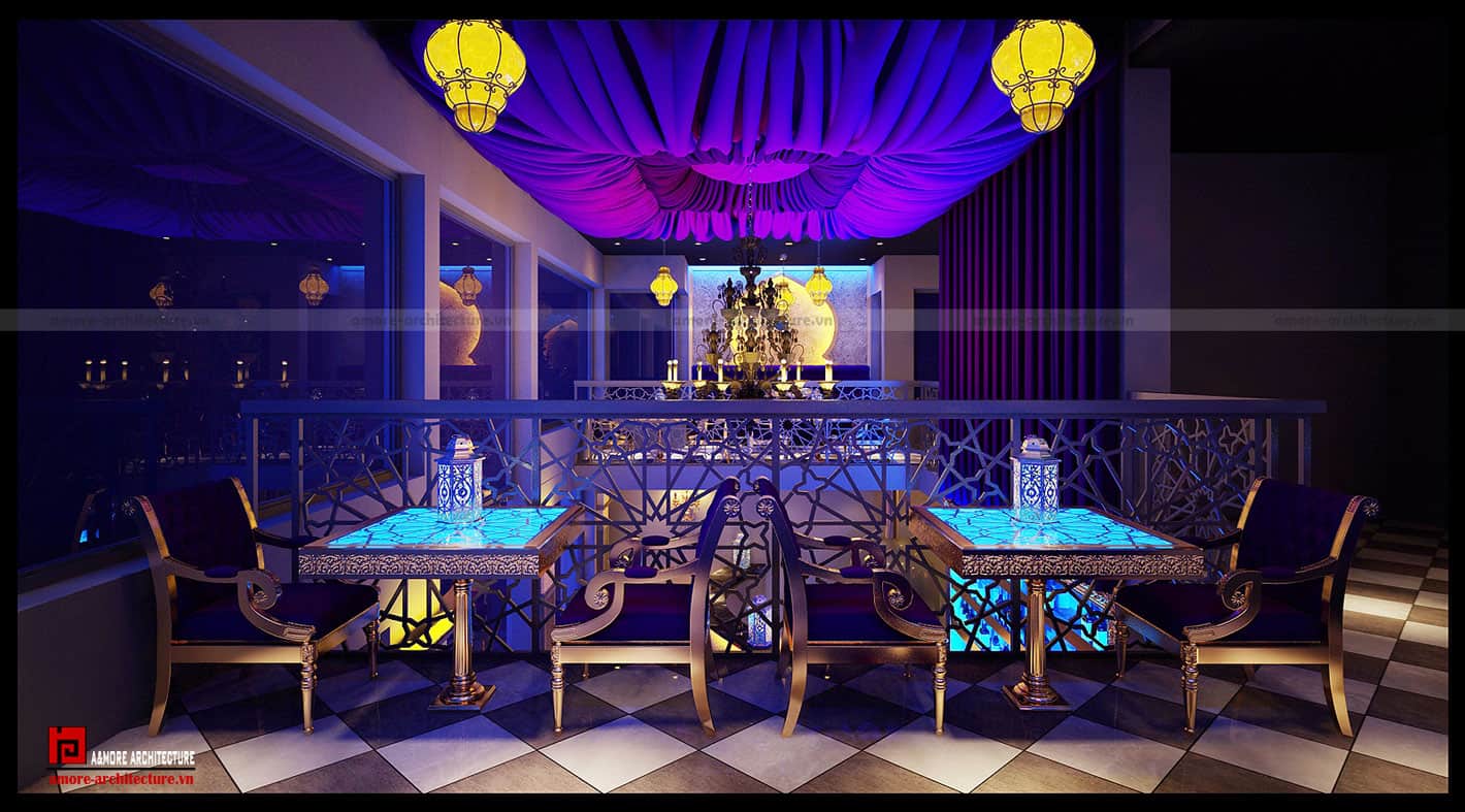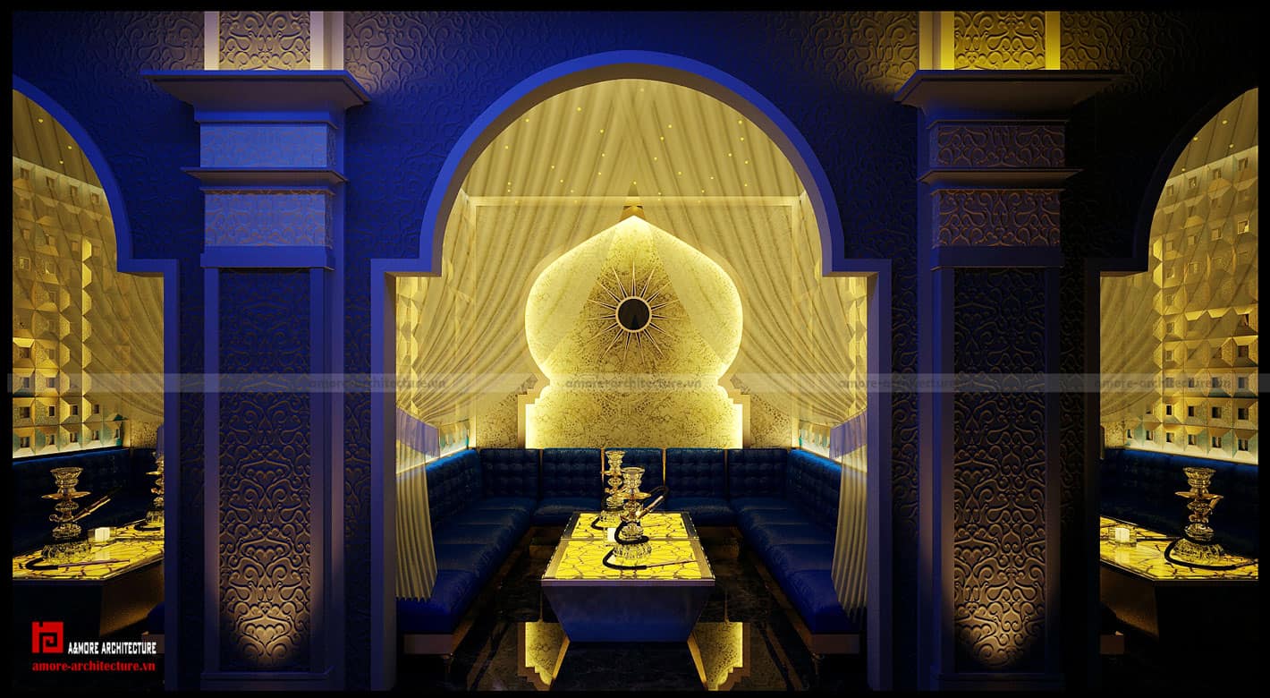 Các quốc gia Arap từ xưa tới nay vốn luôn nổi tiếng về sự giàu có và xa hoa, chính vì lẽ đó, việc chọn lựa đồ nội thất cho quán café Xuân Diệu càng phải thật đẳng cấp để hài hòa với không gian chung và thể hiện được phong cách của quán. Các loại đèn trang trí, bàn ghế… được chúng tôi lựa chọn theo phong cách classic kết hợp với các hoa văn họa tiết mang hơi hướng của vùng Trung Đông.