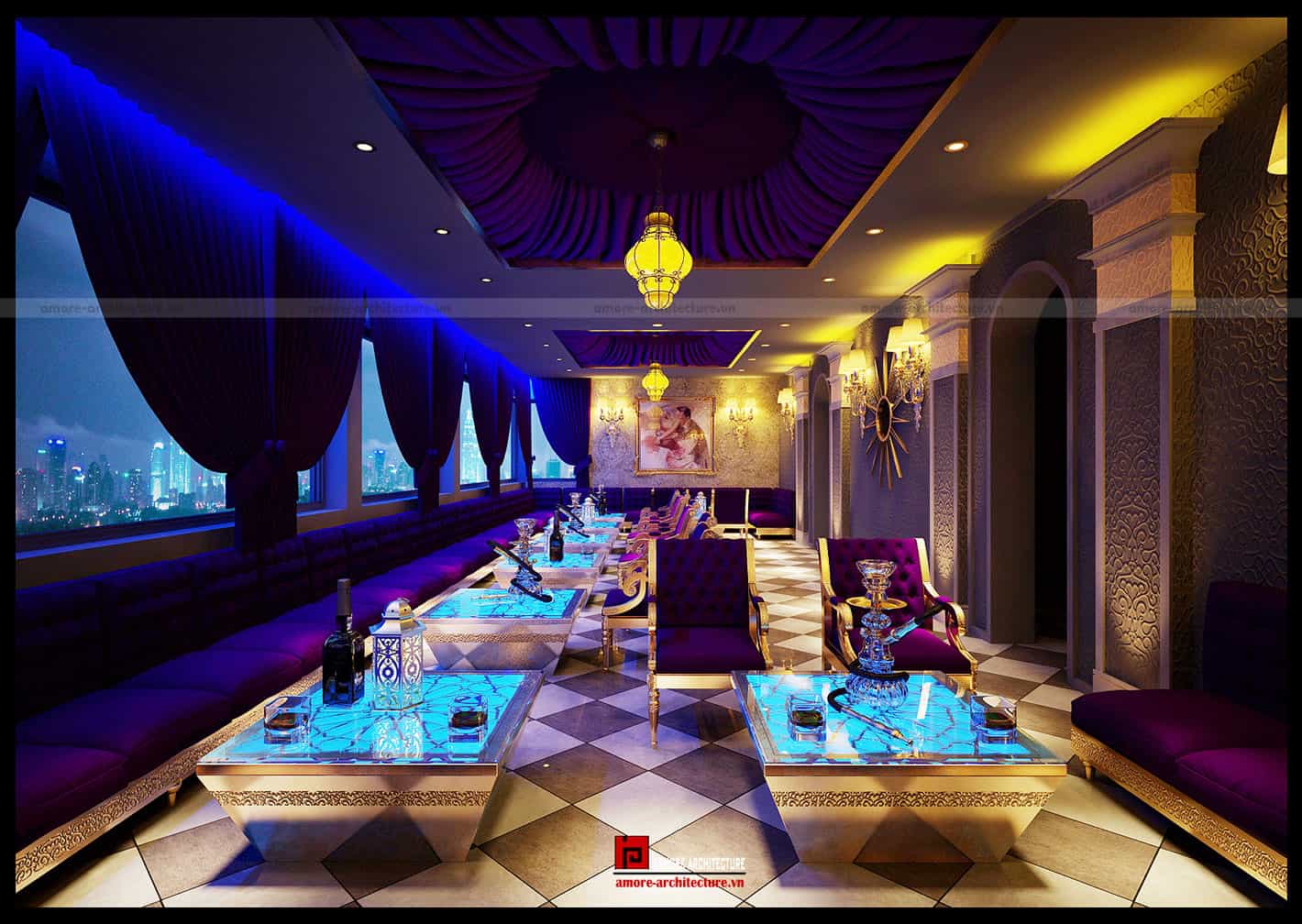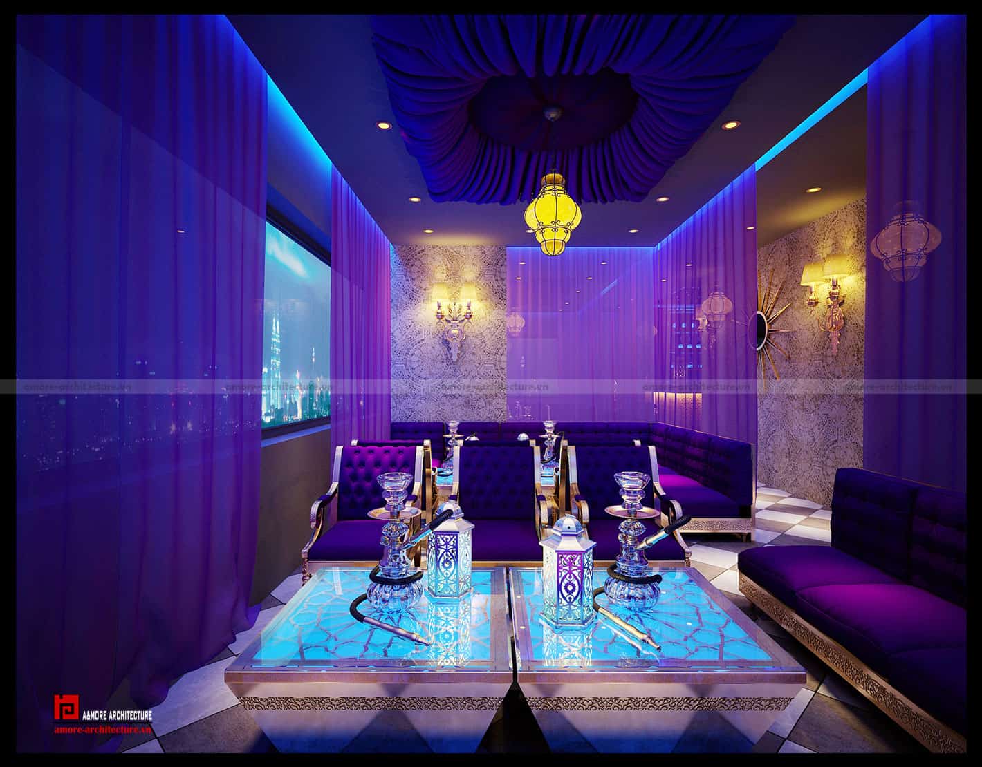 Sự huyền bí trong những câu chuyện của vùng đất Ba Tư xa xưa đã được thể hiện ngay trong gam màu tím với những sắc độ đậm nhạt khác nhau. Màu tím không chỉ là sự bí ẩn, nó còn đem lại những nét mềm mại , quyến rũ như nàng Seherazat vậy. Và để kết nối với sự bí ẩn, mềm mại của sắc tím, những mảng trần của thiết kế nội thất quán cafe này được sơn đen kết hợp với những dải lụa tơ tằm Organza đã tạo ra sự hài hòa đến từng chi tiết.
